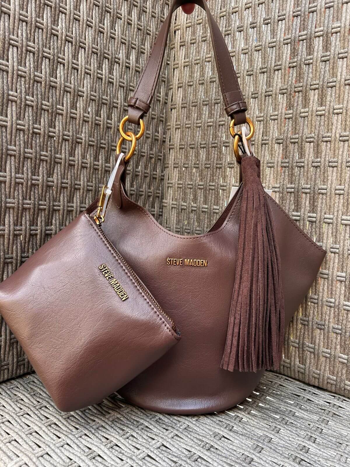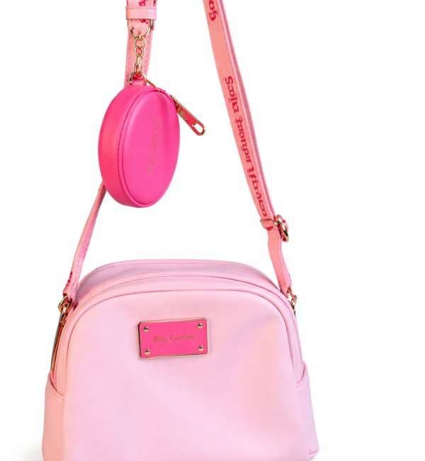 Bandolera Juicy Couture de diseño moderno y femenino, confeccionada en material tipo cuero suave al tacto. Incluye un mini pouch desmontable en tono fucsia que aporta funcionalidad y un toque trendy. Su correa ajustable con logo estampado realza el estilo icónico de la marca, ideal para looks urbanos y casuales.