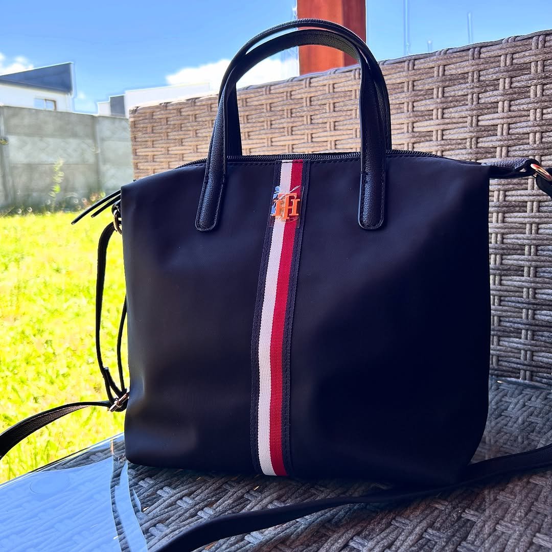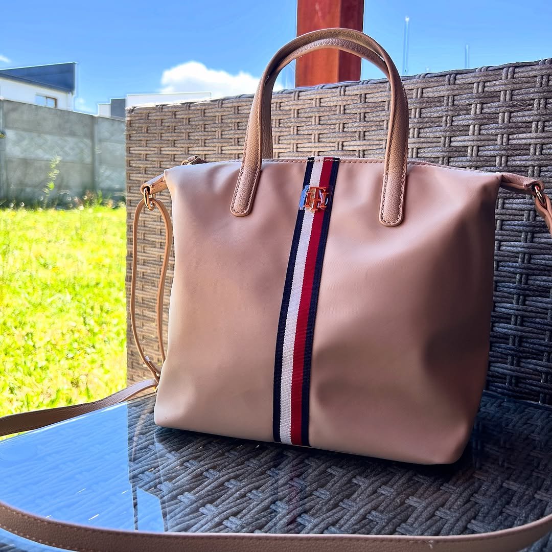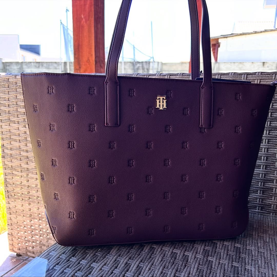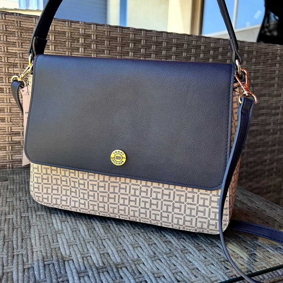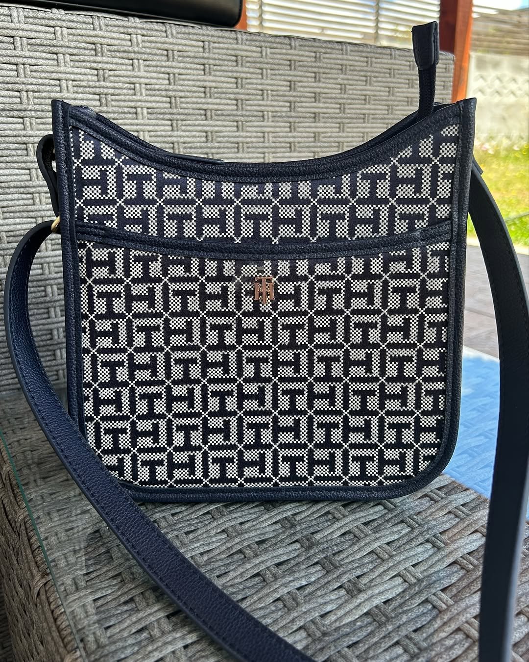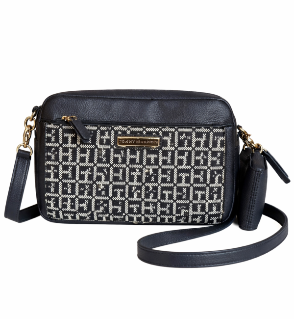 Bandolera Tommy Hilfiger de diseño elegante y moderno, ideal para el uso diario. Presenta el icónico estampado monogram de la marca en tonos contrastantes sobre base azul marino, combinado con detalles en ecocuero de alta calidad. Su formato compacto la hace práctica y sofisticada a la vez.