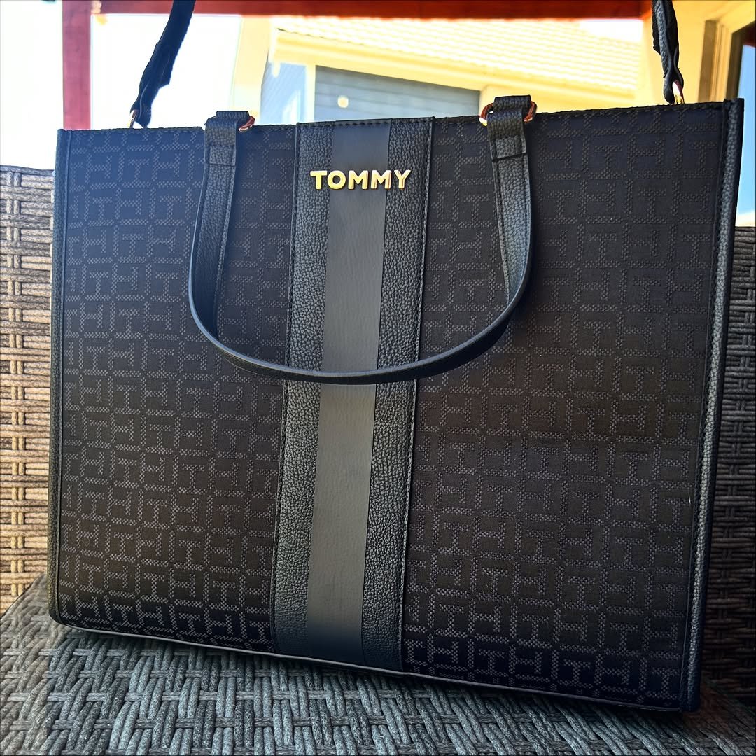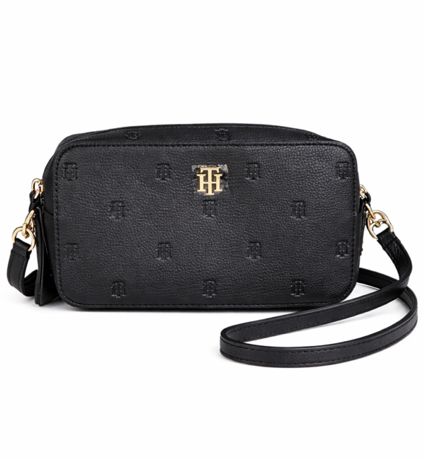 Bandolera Tommy Hilfiger de diseño elegante y atemporal, confeccionada en material tipo cuero con logo TH en relieve distribuido por toda la superficie. Su tamaño compacto y color negro la convierten en un accesorio versátil, ideal para uso diario o salidas especiales, manteniendo siempre un look sofisticado.