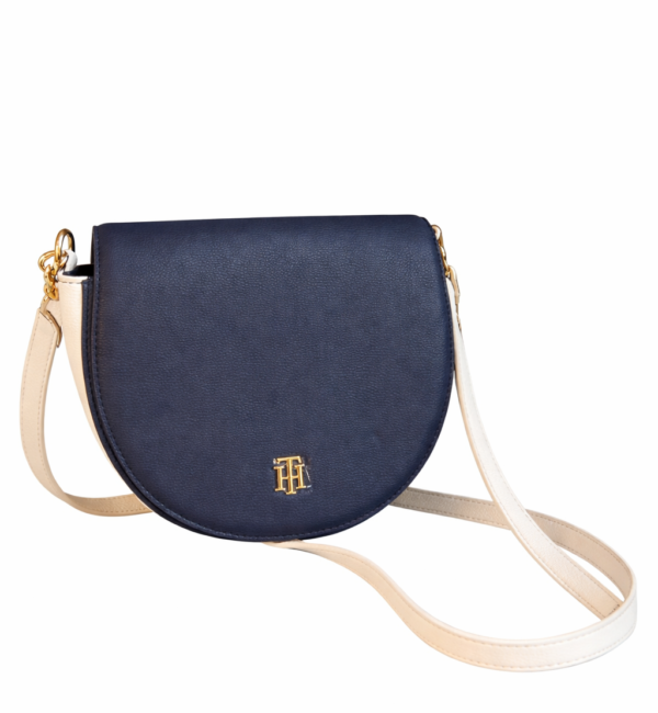 Bandolera Tommy Hilfiger de diseño elegante y minimalista, confeccionada en material tipo cuero de alta calidad. Su formato half moon y color azul marino la convierten en un accesorio versátil, ideal para uso diario o salidas especiales. Incorpora el logo metálico frontal que aporta un toque sofisticado y distintivo de la marca.