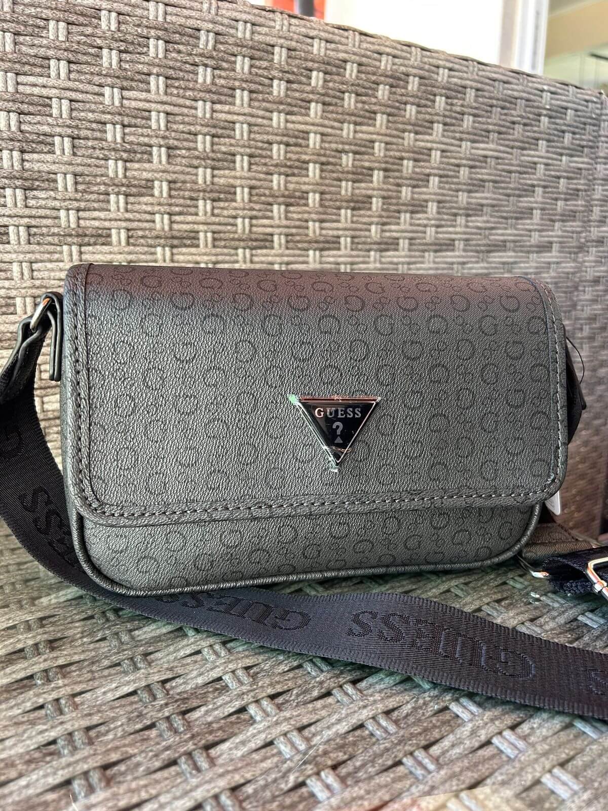 El bolso de la imagen es una bandolera (crossbody) de la marca Guess, de color verde oscuro o militar, que presenta el icónico logotipo triangular de la marca en la solapa frontal y un patrón de monograma sutil. Está fabricado con un material similar al cuero sintético (poliuretano) y cuenta con una correa ajustable de tela con el nombre de la marca repetido.