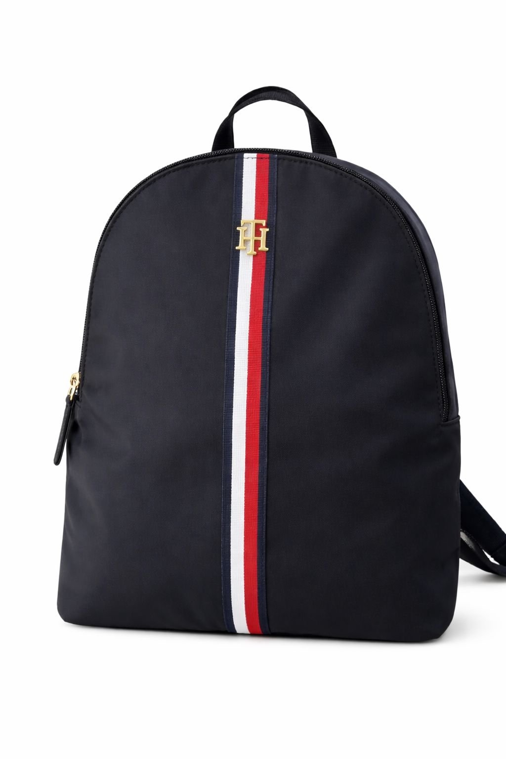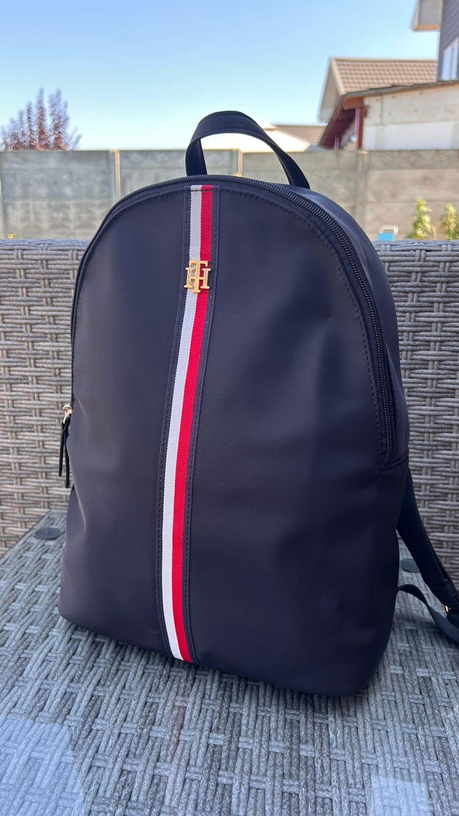 Mochila femenina Tommy Hilfiger con diseño moderno y estilo deportivo elegante. Presenta acabado en color negro con franja vertical en tonos rojo, blanco y azul que aporta un toque distintivo y sofisticado. Ideal para el día a día, trabajo, estudio o viajes.